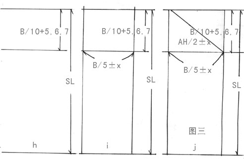 第三種:從上平線直接確定袖山的高度,可用公式:B/10+5,6,7,再定袖肥,用公式B/5±x。(如圖h、i、j)根據(jù)面料的性能,再調(diào)節(jié)出最佳的吃勢量。一般面料的吃勢量,可用AH/10-(1.5~2cm)來確定。