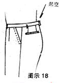 開襠過小,或挖度不到位,后襠部位即被前襠拉緊,引起抽吊(見圖示16)﹔ 開襠過大或挖度過大,后襠即會下垂,出現不正常的松馳(見圖示17)﹔ 后翹過高,坡度過大,會引起褲腰后部起空、不貼身(見圖示18)﹔ 后翹高,再加上臀部不到位,后襠上端產生水扭(見圖示19)﹔ 后翹偏低,不僅會引起后襠緊勢,同時也會牽連中縫起扭(見圖示20)。