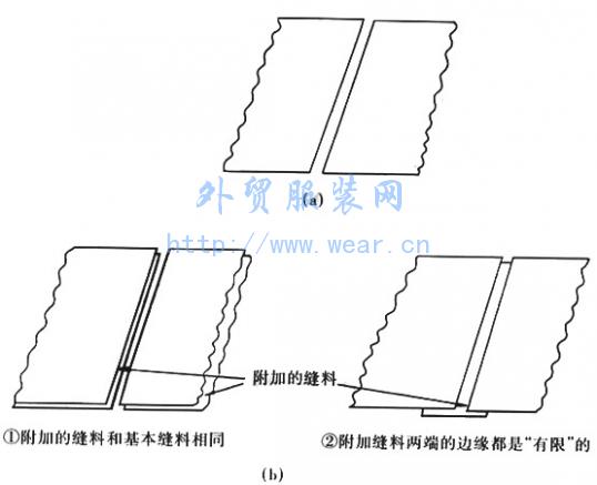 第五類縫型的附加縫料可以一端邊緣是"有限"的或兩端邊緣都是"有限"的,如圖(b)所示。