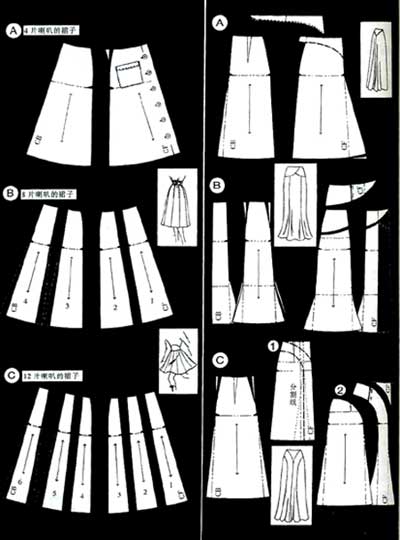 | 通常,裙子原型是簡單的半截式裙子。不過因為它是紙做的,所以可以折疊起來使用。同一個紙樣對其加上前中心線和后中心線就能用于四片裙上,即將前片和后片每片分成兩部分。 裙子的款式通過分片、而變的花樣繁多,在裁片之間添加寬松量能使裙子的樣式進一步增加裙子款式的變化方法還包括:改變織物紋理的使用例如正斜向或交叉向的裙子。對所有形狀和大小的裙子添加臀部育克以及許多其他的具體裁剪手段。 例:簡單的多片裙(見圖) 款式A & nbsp4片裙,其前中縫線用沿前中心線排列的扣子代替了,因此需要有搭門(最少需要3~4cm)。在畫前片時,將原形放在離紙邊4cm的位置,留出搭門寬。貼邊可以單獨裁或與前片連在一起,掛面應比搭門寬至少多4cm,即扣眼貼邊應7~8cm。通常貼邊只用在面料上裁出,象翻角一樣,不需包括在紙樣的裁剪中。 因為這是全圓型裙,所以用于做單件裙或“西服式”裙子時,側縫線會有較少的省量。為了使腰部合身,必要時可以在后中心線上加一個小省,如果是制作禮服裙,那么就不能有任何省道,而且所有的縫線應為直線,原型只適合于禮服衣身。 在紙樣上標明直向紗方向(SG)。因為前片有扣眼,所以要以前中心線為直線,后片則以每片的中間軸為直向,因為這樣可以增加裙子的懸垂感。一般后中縫線也幾乎是直向的,除非有時為了使外形線更均衡,會使其有斜向的角度,從而使裙子在身體周圍均勻的展開,而不是后中心線處扁平,卻在側縫處外翹,如果這里以后中心線為直向紗向就會出現此類情況。 款式B  8片裙,它是將4片裙的每一片按縱向從中間剪成兩半得到的。首先畫出全原型裙原型的前片和后片,然后把每片對折,就像做直向紗向標記時那樣。有時可能會有少部分不能完全對折,不過并不要緊。四分之一圓裙原型用的也是這一款型。它用了全原型裙原型的優點,即有著標準的幾何形狀,而并不一定是圓的一部分。加寬底擺(超過原型的160cm)可從臀圍水平線或低一點的地方(虛線處)開始。每個裙片仍是以中間為直向。 款式C 將6片裙的每片平分后得到十二片裙。實際上只用分側前片和側后片,因為前、后幅片本身就是半邊紙樣。由于是完全的全圓型裙,為了使裙子的腰圍緊身就應收一個小省。以裙片的中間為直向紗向。這類款式的裙子,低擺寬度常常達到約2.45m,但是裙片數量多,12條破縫線=24條縫合邊,所以每片的加寬量一般很小,也就是3~4cm。 |