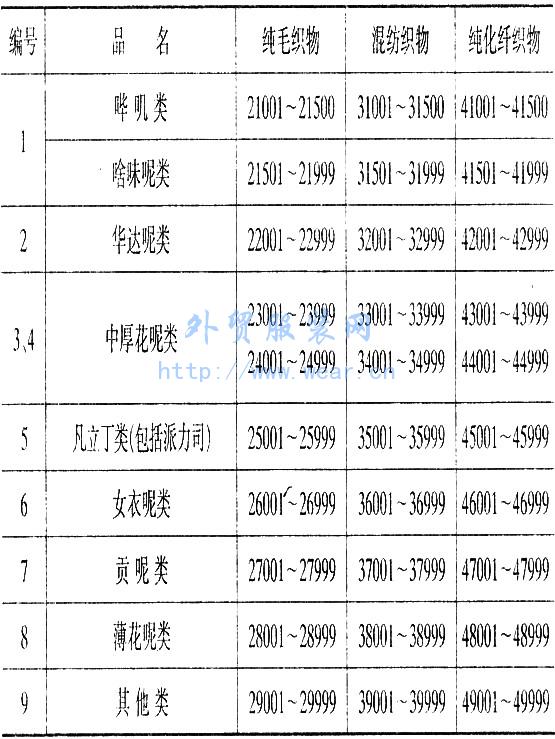 精梳、粗梳毛織物是根據原紡織工業部在1998年頒發的關于"精梳毛織品、粗梳毛織品的分類、命名及編號"的標準(FZ/T20015.2-1998)進行編號的。